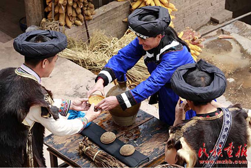 主人家抬出幾大壇米酒,拿出幾十根空心麻桿插入壇內(nèi),供吸吮米酒