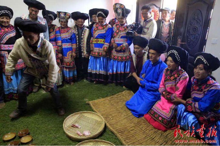 晚飯后,是新郎新娘參拜儀式,在香煙繚繞中,新郎新娘男右女左的并肩站在祖宗堂前,在主婚人洪亮的祈禱聲中,新郎新娘一拜天地,二拜祖宗,三拜父母,而后新郎新娘雙雙對(duì)拜。禮畢,主婚人要給新郎新娘取喜名,傈僳族婚禮中取喜名十分重要,結(jié)婚后只用喜名。取喜名是根據(jù)結(jié)婚時(shí)男方送往女家的彩禮來(lái)定的,也有以當(dāng)時(shí)的氣候和其它情況為根據(jù)來(lái)定的。宣布喜名后,新郎新娘搶新房,比賽脫婚服,清點(diǎn)禮金和禮物,誰(shuí)點(diǎn)的多,以后就由誰(shuí)當(dāng)家。