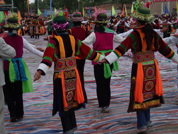 不同地區(qū)的土族舞蹈具有相對(duì)獨(dú)立性,互助的“安昭”、民和的“納頓”、大通的“踏灰”、同仁的“於菟”、甘肅卓尼的“嘎?tīng)枴钡仁亲罹叽淼拿耖g舞蹈。“安昭”,土語(yǔ)稱之為“千佼日”,意為“彎曲”或“轉(zhuǎn)圈”,是土族民間喜慶節(jié)日和婚禮儀式中,用于禮贊祈祝的一種圓場(chǎng)群舞,也是一種歌舞結(jié)合、無(wú)樂(lè)器伴奏的集體舞蹈。一般由男女各半圍成圓圈,由一男子帶領(lǐng),一唱眾和。舞蹈動(dòng)作簡(jiǎn)單質(zhì)樸,舞者兩手由右胯旁起向左上方至右上方劃圓弧,變?yōu)樽笫智谀X前,右手高居于后,似雄鷹翱翔于藍(lán)天?!办遁恕蔽杓椿⑽琛!办遁恕?,是古代楚人對(duì)虎的方言稱謂。每年農(nóng)歷十一月二十日祭山神時(shí),名為於菟的舞者在赤裸的上身繪制虎豹圖案,模仿虎的形象“前端腿跳”舞蹈,達(dá)到祀神驅(qū)邪、祈求平安的目的。