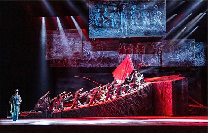 在舞蹈語言的設(shè)計(jì)上,編導(dǎo)融入當(dāng)代元素,使觀眾不但感受到審美的親切與現(xiàn)代感,而且還自然地進(jìn)入回望歷史的情境,對(duì)其思想內(nèi)涵的理解更為準(zhǔn)確。該劇的道具使用和調(diào)度也頗為大氣,令人印象深刻。一組斜坡狀的大型舞臺(tái)道具不但由群眾演員直接移動(dòng)而實(shí)現(xiàn)即時(shí)的場(chǎng)景調(diào)度,還可使演員上下和左右而行,最終組合成巨大的中國(guó)共產(chǎn)黨黨徽,輔助完成了人民英靈和英雄的形象塑造。