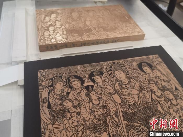 “將敦煌壁畫濃縮雕刻在木板上難度非常大,飛天裙裾要飄逸,菩薩的眉眼要有神,一刀都不能雕錯。”徐晉林最近剛完成以莫高窟444窟和57窟的壁畫為原型的雕版畫,目前累計完成上百件敦煌題材的雕版畫。
