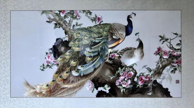 原作是畫家張玉明的工筆畫作品。一對孔雀棲息于爛漫盛開的山茶花間顧盼回首,相映成趣。整體繡面繡工精細(xì)、絲光迥動,將蘇繡精、細(xì)、雅、潔的特點(diǎn)表現(xiàn)得淋漓盡致。
