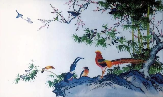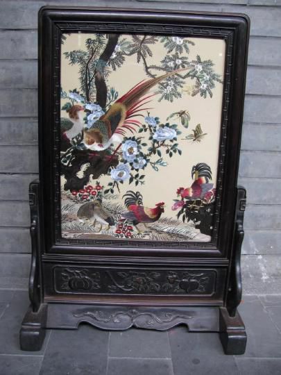 取材于古畫,采用蜀繡的運(yùn)針、輔針、切針、沙針、滾針、打籽針等針法繡制。樹木花草層次分明、古樸自然,錦雞蝴蝶色彩艷麗。