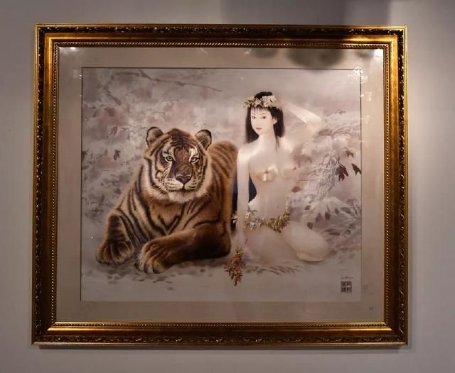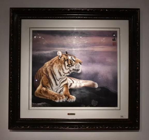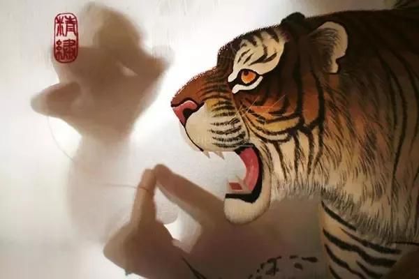 本幅繡品首次成功地將人物肖像圖方式引入傳統(tǒng)走獸刺繡之中。作者用細(xì)膩的針法細(xì)致精準(zhǔn)地繡出了老虎根根可辨的絨毛和少女光滑細(xì)膩的皮膚,形成極大的反差,極具視覺沖擊力。