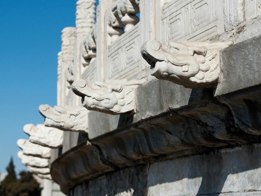 螭首是古代建筑石作制度中的主角之一,有平衡臺基望柱的重力和排水的功能,同時也是建筑上的裝飾構(gòu)件,是標志著封建禮制建筑等級的象征,是實用與裝飾的完美結(jié)合的建筑裝飾小品。節(jié)奏和韻律是中國古建筑的重要特點。