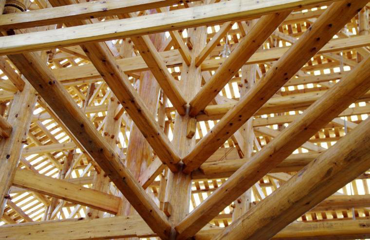 中國的木建筑構(gòu)架一般包括柱、梁、枋、墊板、桁檁、斗拱、椽子、望板等基本構(gòu)件。這些構(gòu)件相互獨立,需要用一定的方式連結(jié)起來才能組成房屋。在中國建筑中,原則上采取榫卯連接的方式,必要時也會用鐵釘。