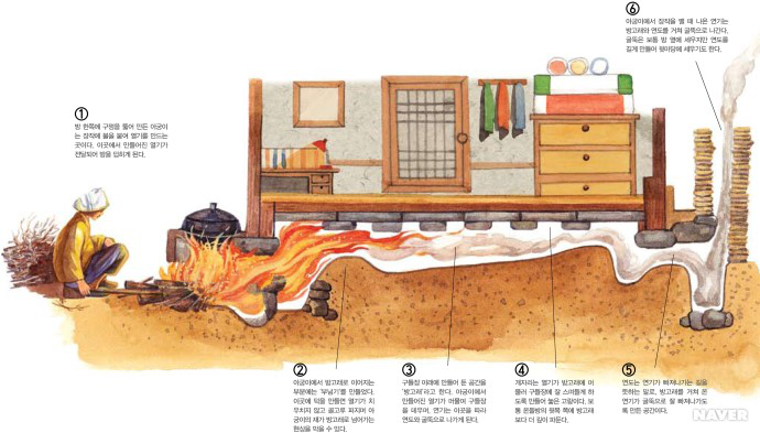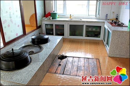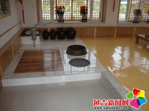 在傳統(tǒng)的朝鮮族民宅中,炕和鍋臺(tái)是平齊的,需要燒火做飯時(shí),主婦會(huì)打開(kāi)架在柜臺(tái)一側(cè)的移動(dòng)木板,下到地面水平線(xiàn)以下的“灶坑”點(diǎn)火做飯。傳統(tǒng)的炕采用長(zhǎng)筒式結(jié)構(gòu),煙火由一洞內(nèi)循環(huán)排出,使每洞都有煙火串入,炕即溫?zé)?。朝鮮族的火坑高度為30-40厘米,但炕洞向下挖入,炕面抹白灰,表面糊油紙或鋪草簾子,炕面平整。隨著物質(zhì)條件的改善,炕面改鋪纖維板或者地板膠,既美觀又耐用。