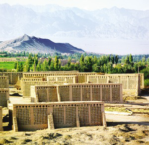 吐魯番曬葡萄干的“陰房”。這里處于我國(guó)海拔最低的盆地,也是維吾爾族聚居區(qū),冬冷夏熱,民居既要防寒又要防暑。吐魯番盛產(chǎn)葡萄,每戶(hù)皆有曬葡萄干的陰房,因此,住房與陰房合一的民居成了吐魯番的特色。大的陰房都集中建在山坡上,以利運(yùn)輸,小的陰房