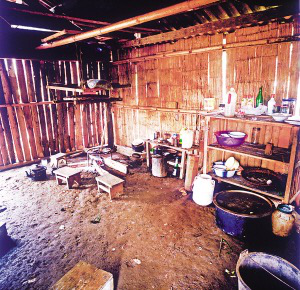 房內(nèi)一般隔成里外兩間,里間狹小,光線暗,是主人的臥室,只放雙人床和一小部分生活用品。外間寬大,是生火煮飯、聚會待客和子女就寢的地方。火塘設在里間屋的門外,放鐵制三腳架,三腳架對應的方位有固定的用途,即靠里間房門一方為主人的座位,靠外間房門一方為客人的座位,火塘上方靠墻處為子女的床位。如有成年子女和新婚夫婦,則在外間再隔出小間,里間和外間存放著生產(chǎn)用具和酒具。房內(nèi)幾乎沒有什么家具和裝飾性的陳設,有的甚至沒有桌椅和床鋪,只在火塘周圍鋪著竹席或木板,合衣向火而眠?;鹛辽厦?米多高處懸掛著竹編的約1米見方的架子,上面放著食具、鹽巴、辣椒等,也是烘烤牛肉干的地方。架子上面靠房頂處并排放著幾個粗大的竹筒,里面存放糧食。這幾年的新村民居,在保持傳統(tǒng)民居特征的前提下使用了新型建材,更堅固,更舒適。