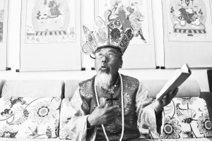 “東巴,在納西語里意為活佛或智者?!痹谟颀埣{西族自治縣圖書館,李瑞山一邊講解,一邊向筆者展示館藏文物,這其中包括占卜紙牌畫、祭祀法杖和東巴經(jīng)等。引起筆者注意的是一幅形似唐卡的卷軸畫,畫中的主人公竟是藏族詩人倉央嘉措?!坝脰|巴文所寫的《卓伯所》一書里,記載了納西族與藏族、白族先民之間同宗共祖的兄弟關(guān)系,這點(diǎn)與木氏宗譜碑上所刻是一致的。所以,我們有關(guān)于藏族的記載并不奇怪,民族交融自古就有。”
