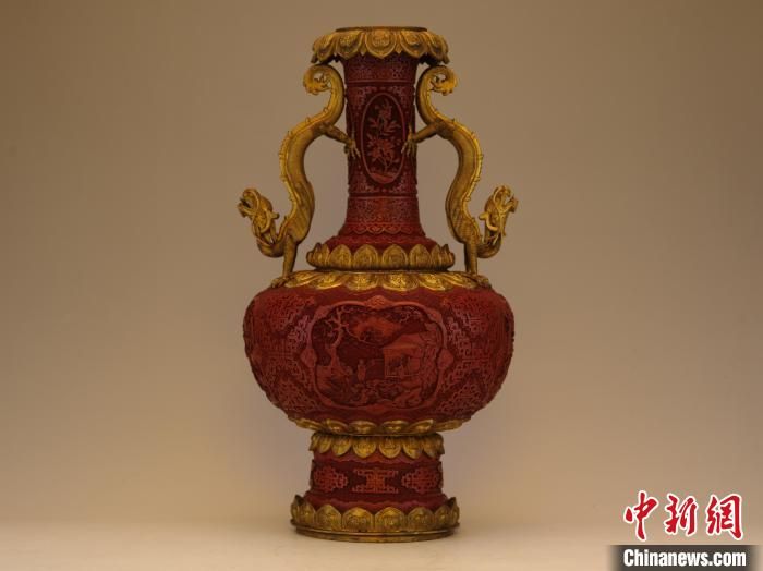 沈陽故宮博物館敬典閣館藏珍寶展展廳展出的乾隆款剔紅開光山水人物紋龍耳瓶。 沈陽故宮博物館供圖