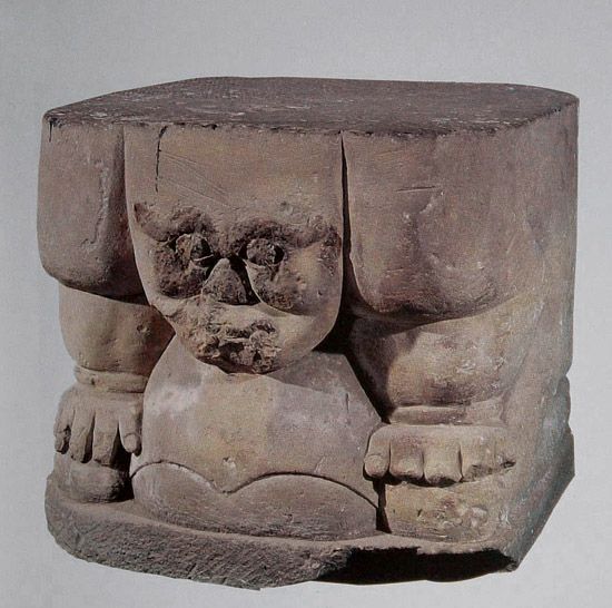 圓雕,白砂石質(zhì),近似正方體。圓雕男性人像,面部渾圓,顴骨高突,粗眉上翹,雙目圓睜且外突,鼻梁短粗,獠牙外露,下頜置于胸前,裸體,腹有肚兜,肩于頭齊,肘部后屈,雙手扶膝,下肢屈跪,背部平直。座頂左上角陰刻西夏文三行,計(jì)15個(gè)字。第一行4字漢譯為“小蟲(chóng)曠負(fù)”;第二行4字漢譯為“志文支座”;第三行7字漢譯為“瞻行通雕寫(xiě)流行”。背部陰刻漢文一行6字“砌壘匠高世昌”,為西夏石雕工匠的姓名,彌足珍貴。雕像以夸張的手法表現(xiàn)了負(fù)重者的神態(tài),反映出西夏時(shí)期石雕藝術(shù)的獨(dú)特風(fēng)格。迄今在西夏陵區(qū)多座帝陵的碑亭遺址中,已出土這類支座14件,但刻有西夏文字的僅此一件。