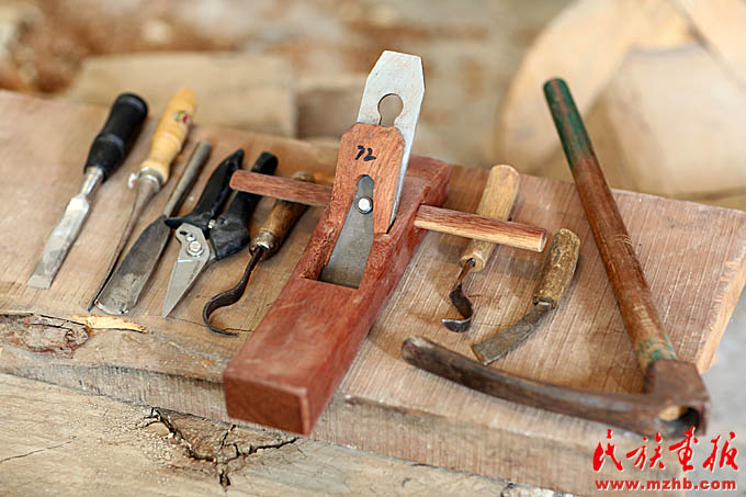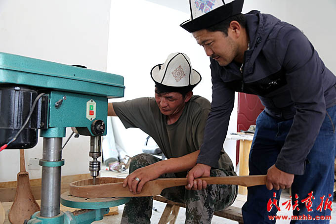 這間工作室的主人叫阿吉別克·買買達洪,主人恰巧有事外出,他的弟弟,年輕朝氣的吾蘭別克張羅著給記者們當起了翻譯。正忙活著打磨樂器的小伙叫木沙,今年31歲,問起庫姆孜的制作工藝,他才把頭抬起來,笑著說:“我做這個十年了。一把庫姆孜,往往琴身是杏木,蓋子是松木。杏樹、松樹木切割后放在干燥的地方,一兩年后才能用?!睅炷纷斡腥?,琴弦以前用動物的腸子手工自制,現(xiàn)在有的工匠開始使用現(xiàn)成的弦。判斷庫姆孜手工藝人手藝高低的關(guān)鍵何在?木沙解釋說,“要看彈出來的聲音。木頭的原料不同,出來的聲音也不同?!边@個回答似乎也隱藏了手工藝人的絕活所在,可意會不可言傳的技藝,往往在一代代的工匠手中以師徒親授的方式傳承。