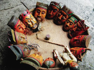 現(xiàn)在的16具面具,是班主宋成權(quán)在1997年春帶著戲班子成員,從正月初一到十五,逐家逐戶跳花燈收賀錢和群眾集資共籌集資,然后由宋成權(quán)到重慶酉陽請(qǐng)師傅雕刻的。