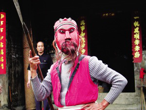 陽戲是一種原生態(tài)戲劇,其中道具的使用必不可少。主要包括服裝、面具、法器、樂器。面具在陽戲表演中占有突出的地位,是神靈的憑依和具象化。其面具有關(guān)圣帝、皇生、小生、老生、老丞相、元帥、老臣等共16面。在陽戲表演中,旦角(貴妃)是沒有面具的,搭帕子在頭上,身穿旦角服裝。面具為白楊木質(zhì)材料,精雕細(xì)琢,上面覆以濃重的彩繪。面具造型別致古樸,以頭冠和面相的特征區(qū)分角色,在藝術(shù)風(fēng)格上頗具地方特色。