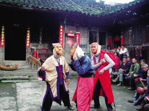 土家族陽戲在貴州、湖南、重慶等省、市都有流傳,湖南省張家界陽戲和重慶酉陽陽戲均被列入了省級(jí)非物質(zhì)文化遺產(chǎn)名錄,得到保護(hù)和重視。貴州沿河土家族自治縣的土家族陽戲同樣古樸而充滿風(fēng)韻,5月19日,當(dāng)?shù)氐囊慌幕ぷ髡邤M通過挖掘整理,把獨(dú)具地方特色的面具陽戲申報(bào)為省級(jí)非物質(zhì)文化遺產(chǎn),希望沿河陽戲同樣受到重視和保護(hù)。