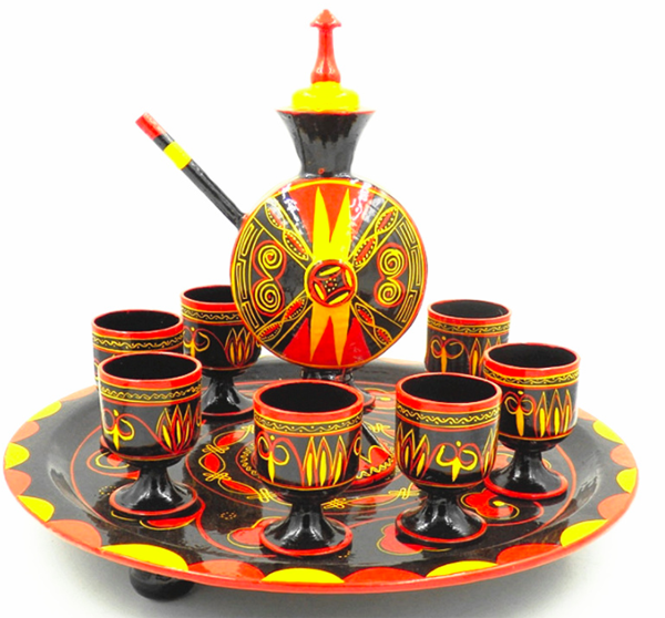 彝族漆器種類很多,僅餐飲具就有餐桌、飯盤、肉盤、湯缽、大小碗、勺、舀酒瓢等;酒具,有酒壺、酒杯等。民族風(fēng)格特別突出的是鷹爪杯、雁爪杯、牛角杯和野豬蹄杯等飲酒器皿。鷹、野豬等都是很兇猛的禽獸,用兇猛動(dòng)物身上的材料做酒杯,標(biāo)志著主人的靈巧與勇猛。他們認(rèn)為戰(zhàn)勝了靈巧與兇猛的東西,其本身就更靈巧與勇猛。