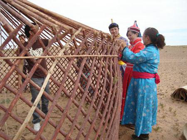 捆繩墜繩。捆繩是把相鄰兩片哈納的口綁在一起,使其變成一個整體的細繩,用駱駝膝蓋上的毛和馬鬃馬尾搓成。墜繩是套瑙最高點拉下的繩子。蒙古人對這根帶子分外看重,用公駝和公馬的膝毛或鬃尾搓成。大風起時把墜繩拉緊,可以防止大風灌進來把氈房吹走。