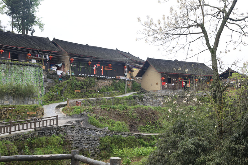 梨子寨共有28戶人家,當年全寨烏黑破落的房屋如今全部修繕一新,并保持了苗族民居青瓦、木板、竹籬、黃泥墻的特色,寨子里的泥土路也鋪上了青石板,屋頂、院壩、石階、游道及田頭落滿了白色梨花花瓣。穿青衣包頭帕的苗族女子在田間鋤地、拔草,青山環(huán)抱的梨子寨無比清幽。
