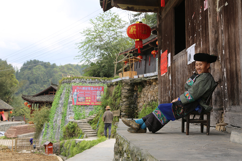石拔三大媽的家位于村口,老人正在院子里曬太陽。這里的苗族習俗保持得很好,村民日常生活中大多是苗族傳統(tǒng)打扮。大媽頭裹黑帕頭、穿一件綠色繡花苗裝,利落得很。見來了客人,她趕緊把我往屋里讓。