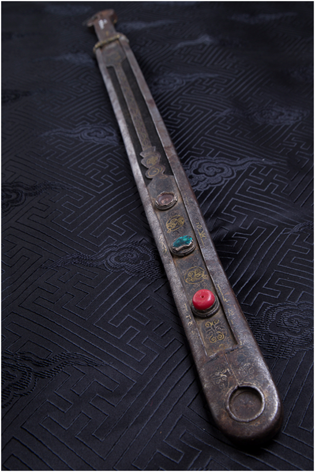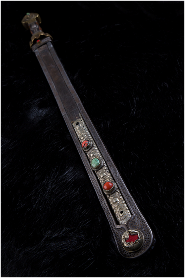 安多地區(qū)主要以放牧為主,牧民的刀主要用于宰殺和吃肉,有嚴(yán)格的男用女用之分,男式刀長度在一尺以上,女式刀在一乍左右,刀鞘的底部和刀柄的末端上翹,呈船形。安多人喜歡珠寶,頭飾、胸飾、腰飾無不光燦耀人,這些飾物同樣被用在刀上,刀鞘和刀柄錨金錯銀,鑲嵌著珊瑚和綠松石,像精美的藝術(shù)品。