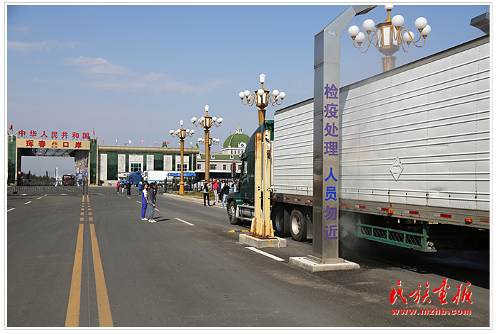 不斷有旅游大巴和貨車從琿春口岸駛過。圖為準備入境中國的俄羅斯大貨車做檢疫處理