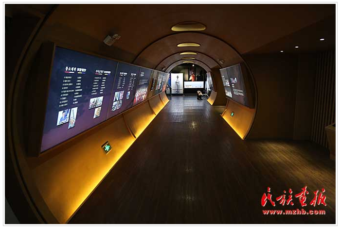 一樓展廳主題為“舞樂風(fēng)情”,展廳墻體為一道曲線,別致新穎,據(jù)了解,展示舞蹈的曲線墻設(shè)計(jì)靈感來自朝鮮族象帽舞?!跋竺蔽琛笔寝r(nóng)樂舞拓展項(xiàng)目,國家級(jí)非物質(zhì)文化遺產(chǎn),是朝鮮族“農(nóng)樂舞”中表演難度和藝術(shù)價(jià)值最高的表演形式。參觀者走進(jìn)互動(dòng)體驗(yàn)區(qū),可以戴上象帽體驗(yàn)飄帶飛舞的熱烈奔放感?!跋竺蔽琛钡娘h帶不斷向上盤旋,代表著朝鮮民族對(duì)未來生活的祝福。