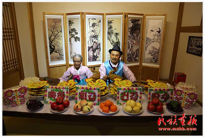 朝鮮族人民非常注重禮節(jié),尤其崇尚尊老愛幼的傳統(tǒng)美德。步入廳堂,回婚禮(為紀(jì)念結(jié)婚60周年而舉行的賀禮)中,新郎新娘的蠟像引得大家駐足觀看,新郎的衣著形似明朝時(shí)期的官服,頭戴官帽,據(jù)說“新郎官”的稱謂就由此而來。隆重的回婚禮教育人們忠于愛情,也是儒家思想中“修身齊家治國平天下”中的“齊家”思想的延續(xù)。走進(jìn)另一廳堂,朝鮮族的花甲禮,六十為一甲子,花甲之意來源于此。花甲禮是朝鮮族家庭為60歲老人舉行的大型生日宴。在擺滿各種花色的食品的“大席”前,兩位老人面南端坐,接受兒孫、親朋好友的跪拜與祝福。