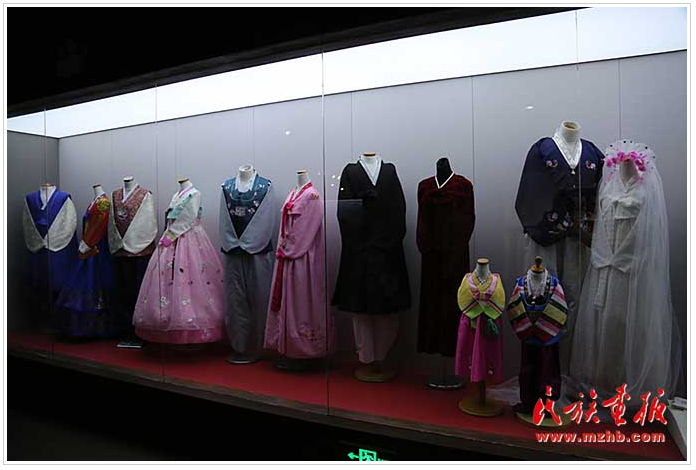 展廳最后一個(gè)展區(qū)是朝鮮族服飾展柜,素凈、淡雅的朝鮮族傳統(tǒng)服飾