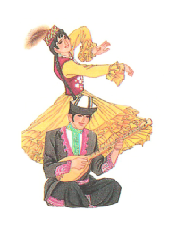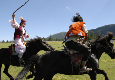 哈薩克族的傳統(tǒng)樂器可分為彈奏樂器、吹奏樂器以及打奏樂器。其中“冬不拉”、“薩孜”和“布特根”屬彈奏樂器;“斯伯孜俄”、“斯爾那依”等屬吹奏樂器;“達布拉”、“哈拉”等屬打奏樂器。無論是哪種類型的樂器無疑都將哈薩克族人民豪放灑脫,但又不失柔軟細膩的情感表現(xiàn)得淋漓盡致。哈薩克族的舞蹈剛健有力,瀟灑優(yōu)美,如“喀達卓日哈(黑走馬)”、“狗熊舞”、“鷹舞”、“擠奶舞”等都是反映哈薩克族人民日常生活的民族舞蹈。除歌曲、舞蹈以外,哈薩克族還有姑娘追、叼羊、賽馬等妙趣橫生的體育娛樂活動。