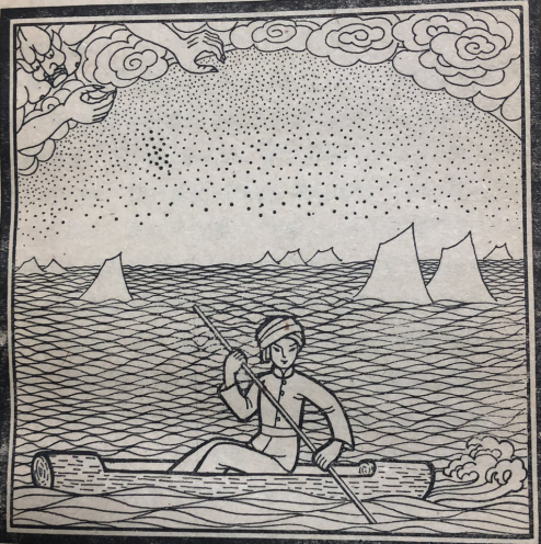 厄霞看見(jiàn)札努札別依然沒(méi)有餓死,又想出了一條毒計(jì):他把天河上的水放下來(lái),整個(gè)大地變成白茫茫一片汪洋大海。跑到高山去的人僥幸沒(méi)有淹死。住在平地上的人,都被洪水淹死了,厄霞以為這一次札努札別也一定淹死了。但當(dāng)厄霞來(lái)看時(shí),札努札別坐在掏空了的木槽里漂在水面上,依然沒(méi)有淹死。于是,原來(lái)不知道造船的人們,從這次起,后世便知道造船了。