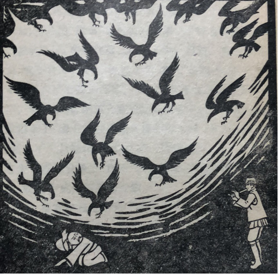 誰知笛聲一響,成群的兀鷹像是聽了誰的召喚,黑壓壓的一大片,直往奴隸主頭上飛來。奴隸主知道,只要鷹落下來,自己就沒命了,便急忙向娃發(fā)求饒道:“快把鷹叫開,你要啥我給啥!”娃發(fā)隨口說道:“給達(dá)卜達(dá)爾的塔吉克人每家十只羊,十頭牛,十峰駱駝,行嗎?”奴隸主連忙點(diǎn)頭:“行!行!要什么都給?!边@時(shí),娃發(fā)又吹起了“鷹笛”,鷹群才飛走了。