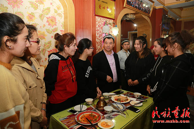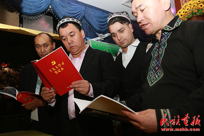 新疆美食城店主阿地力·買買提帶領(lǐng)維吾爾、哈薩克、回族等員工學(xué)習(xí)十九大報告
