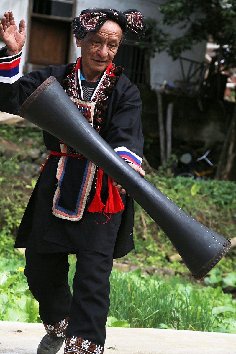 聽罷門唻歌,再賞羊角長(zhǎng)鼓舞。轉(zhuǎn)鼓、跨步、收腿、回腰、碰角……這套由多人合作的舞蹈,動(dòng)作粗獷,節(jié)奏明快,舞者配合默契,音韻鏗鏘。今年66歲的老藝人盤福貴,舞起祖宗留下來的已有一百多年歷史的羊皮長(zhǎng)鼓,身手矯健、動(dòng)作敏捷,讓人驚嘆不已。盤福貴的爺爺、父親都是跳羊角長(zhǎng)鼓舞的高手,父親把這項(xiàng)技藝傳授給他,如今他又收女兒和孫子為徒,已是五代傳承了。