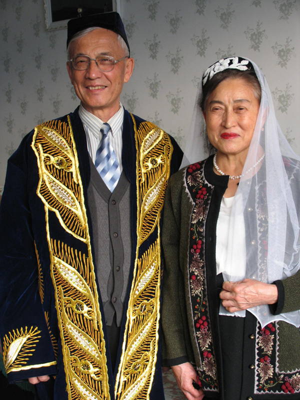 烏孜別克族男子的傳統(tǒng)服裝是一種長度過膝的長衣,長衣有兩種款式,一種為直領(lǐng)、開襟、無衽,在門襟、領(lǐng)邊、袖口上繡花邊。信服上有花色圖案,十分美觀;另一種為斜領(lǐng)、右衽的長衣,類似維吾爾族的“袷袢”。腰束三角形的繡花腰帶,一般年輕人的腰帶色彩都很艷麗,所穿領(lǐng)邊、袖口、前襟開口處都繡著紅、綠、藍(lán)相間的彩色花邊圖案,表現(xiàn)了烏孜別克族工藝美術(shù)的特點(diǎn)。老年人卻愛穿黑色長衣,腰帶的顏色也偏于淡雅。烏孜別克男女傳統(tǒng)上都愛穿皮靴、皮鞋,長靴外面還常穿膠制淺口套鞋,進(jìn)屋時脫下套鞋,就可以不把泥土帶進(jìn)屋內(nèi),十分衛(wèi)生。