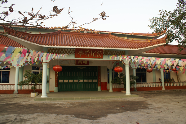 澫尾哈亭是京族哈亭中最為講究的一個(gè)。哈亭的頂部呈“八”字形兩面坡,是先用鋼筋水泥鋪平,然后再蓋上土紅色琉璃瓦,四角建成飛檐。屋脊正中立有“雙龍戲珠”雕塑,哈亭大門門楣上掛的是書寫有“哈亭”二字的大牌匾,旁邊的墻體上用紅漆寫明哈亭建造的相關(guān)情況。哈亭正門前有一敞開式的小亭,作為哈亭的輔助裝飾部分,可用于哈節(jié)期間接待來賓休息。小亭的門楣上掛有一塊小牌匾,上書金黃色的“澫尾哈亭”字樣,頂部也立有彩塑“雙龍戲珠”,不過此彩塑沒有哈亭大門正上方頂部的“雙龍戲珠”大。