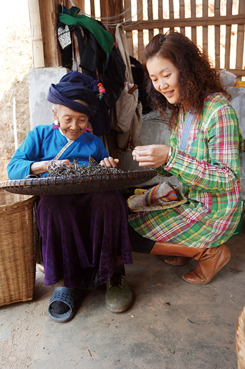 殺青完畢,接下來是手工揉捻。揉捻相較殺青要輕松得多,經(jīng)過處理的茶已開始轉化,散發(fā)出清新的香氣。此時萍芳終于可以坐下來,為自己和我們泡上新鮮的茶。