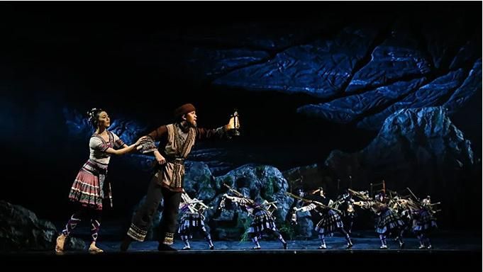 “花腰帶”既是精美的舞蹈道具,又是劇中人物情感的寄托,在整部舞劇中反復(fù)出現(xiàn)。特別是在雙人舞中,“花腰帶”將人物間無形的關(guān)系幻化成有形的聯(lián)系。劇中的蘆笙舞段,不僅僅是男女之間情愛的表達,更突出表達了“開山人”為了讓窮鄉(xiāng)告別貧苦,為大愛舍小愛、努力奮斗的決心,以及對美好生活的向往。傳統(tǒng)民族舞蹈在這部劇中被賦予了不同的含義。