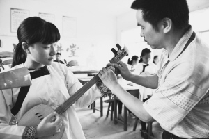 2014年6月27日,貴州省榕江縣車江中學(xué)學(xué)生在教師的指導(dǎo)下,學(xué)唱侗族琵琶歌。