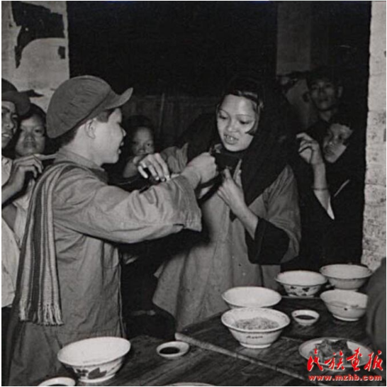 “歌圩”是桂西壯族古老的風(fēng)俗。每年農(nóng)歷正月、二月、四月都有歌圩日。圖為1957年廣西壯族自治區(qū)憑祥市郊區(qū)的歌圩日,這里不但處處歡歌笑語,還有搶花炮、演壯戲、舞彩龍、舞彩鳳、唱桂劇等很豐富的文娛活動