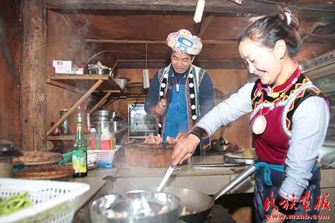 早上,老姆登村73歲的怒族老人斯普早早起來招呼兒子郁伍林、兒媳魯春花:“春節(jié)快放假了,客棧的生意會忙得不可開交,趁著現(xiàn)在客人不多,家里人先吃一頓團圓飯吧?!彼蛊绽习樵缒赀^世,7個兒女中老五郁伍林在身邊照顧她。“過去在春節(jié)才能吃上一頓好飯菜,也要準備很長時間,現(xiàn)在每天都有好吃的,天天在過年,多虧了黨的好政策?!闭f起今天的幸福生活,生在舊社會的斯普感慨萬千。