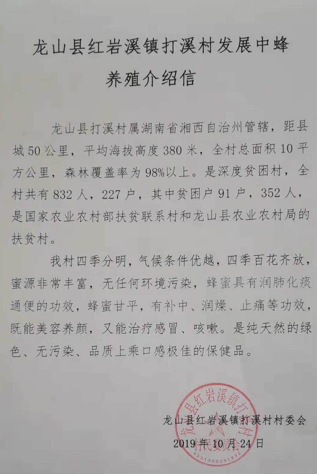 這里四季分明,氣候條件優(yōu)越,四季百花齊放,蜜源非常豐富,無(wú)任何環(huán)境污染。據(jù)湖南省湘西州龍山縣紅巖溪打溪村支部書記沈世平介紹:“我們這兒已經(jīng)有很長(zhǎng)的養(yǎng)殖蜜蜂的歷史,環(huán)境無(wú)污染,田土少,屬于純天然養(yǎng)殖,無(wú)農(nóng)藥,利于中蜂的養(yǎng)殖,并且在2019年4月份的時(shí)候,通過(guò)農(nóng)業(yè)部及農(nóng)業(yè)科學(xué)院的專家實(shí)地考察,認(rèn)證為最佳養(yǎng)蜂環(huán)境。今年獲得鄉(xiāng)政府幫扶,規(guī)劃從龍山縣中心養(yǎng)殖合作社引進(jìn)50箱進(jìn)行集中養(yǎng)殖,明年開始分設(shè)4點(diǎn),一個(gè)點(diǎn)150箱,擴(kuò)大產(chǎn)量,并向全縣推廣?!?/p>