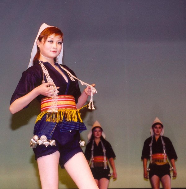 1. 葉車支系 。 葉車婦女的服飾很有特色。紅河縣葉車婦女一般頭戴白尖帽,上衣是靛青色對(duì)開式短袖,無領(lǐng)無扣的土布衣,用寬寬的五色腰帶扎腰。布衣是一件一件地套著穿,少則七八件,多達(dá)十余件,里長(zhǎng)外短可以看出衣服的件數(shù)。下身穿黑色短褲,褲腳口打上適當(dāng)?shù)鸟藜y,褶紋數(shù)與上衣數(shù)大致相等,大腿以下全部裸露。
