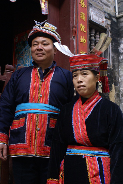 瑤族支系眾多,大凡自稱不同,服裝則有異,在這里就簡單介紹幾種最具特色的瑤族服飾。自稱為“勉”(他稱“盤瑤”或“過山瑤”)的瑤族,分布廣,人口多,其服飾樣式最多。僅頭飾就有頂板、尖頭、平頭和包頭四種頭型。婦女服裝用藍靛染成的布土制成,腰部以上的兩邊衣襟繡有八至十種圖案。上衣無扣,用兩丈多長的黑布作腰帶,腰系圍裙,前胸掛銀牌、項鏈、周圍鑲有成串的紅絨球,頭纏精美的長條彩帶。男子穿著對襟布扣唐裝,以黑布包頭?!懊恪弊逑蛋伺努幍姆?,獨樹一幟。八排瑤男女頭上都插有一根或數根白翎,象征英雄殺敵的利劍。男女均穿無領無扣子琵琶式襟服,腰束布袋,褲長稍過膝。男子身上常背一個五顏六色的繡花挎袋,大都為情人所贈之物。盛裝時,全身上下佩戴精美銀飾,走路叮當作響,甚是悅耳。婦女一般都喜歡佩戴耳環(huán)、手鐲、戒指、頸圈之類的器飾。器飾式樣多種,有的奇色異型,富有特點。