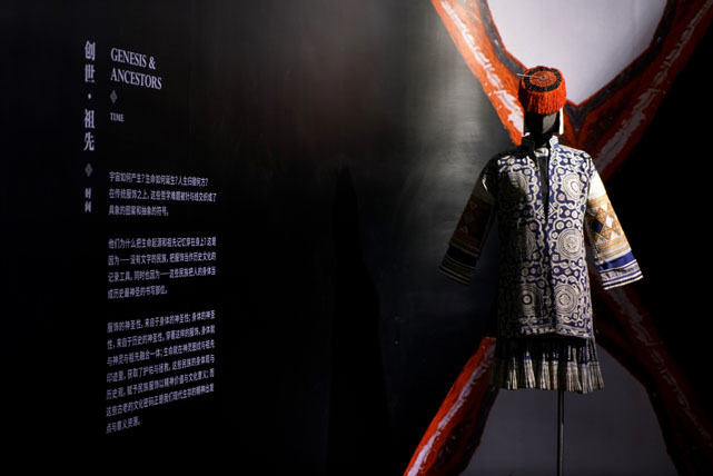 展覽呈現(xiàn)了在傳統(tǒng)服飾中,這些哲學(xué)難題被針與線在不同歷史時(shí)期交織成具象圖案和抽象符號(hào)——對(duì)于創(chuàng)世與祖先,對(duì)于人與神、天與地,傳統(tǒng)服飾成為苗、瑤、彝、侗等民族書(shū)寫(xiě)與描摹的材料;服飾之上精美的紋飾,展現(xiàn)出這些民族心中神靈的形象,勾畫(huà)出民族英雄的事跡,從而建立起關(guān)于自我認(rèn)識(shí)的圖景,生發(fā)出對(duì)宇宙的敬畏。