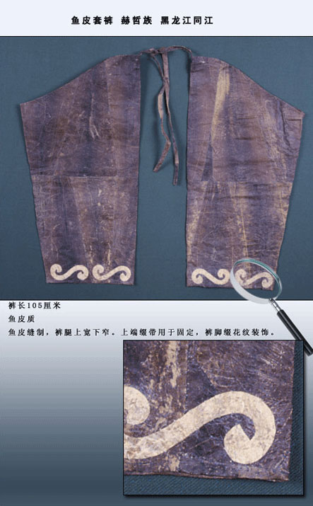 套褲的形式只是兩個筒形褲腿,沒有褲腰,男式的上端為齊口,女式的上端為斜口。赫哲族人稱男式魚皮套褲為 “臥又克衣”,褲邊口有皮條,是用來扎結用的。赫哲族人稱女式魚皮套褲為“嘎榮”,口呈月牙形狀,前邊到腰部,后邊到大腿根部。如圖所示,女式魚皮套褲,長105厘米,褲腿上寬下窄,上端系有綴帶,褲腳綴有“S”形紋飾。魚皮褲造型與普通褲子基本一致,褲腰和褲襠部較為寬松肥大,褲腿稍窄些。