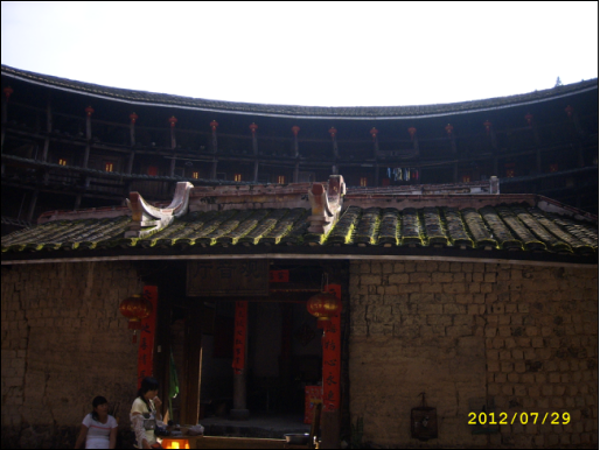 土樓和長城差不多,是用糯米、石灰、蛋清和泥土混合而成的外墻,內(nèi)部是用黃木和杉木,夏可抵暑氣,冬可抵冽風(fēng),還可自動調(diào)節(jié)室內(nèi)的溫度。