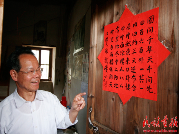 當過小學老師的江進榮為游客介紹承啟樓,還專門寫了首詩