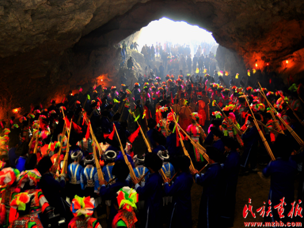 苗族同胞們身著節(jié)日盛裝,在溶洞里舉行“跳洞”,祭祀先祖,祈禱來年風調(diào)雨順