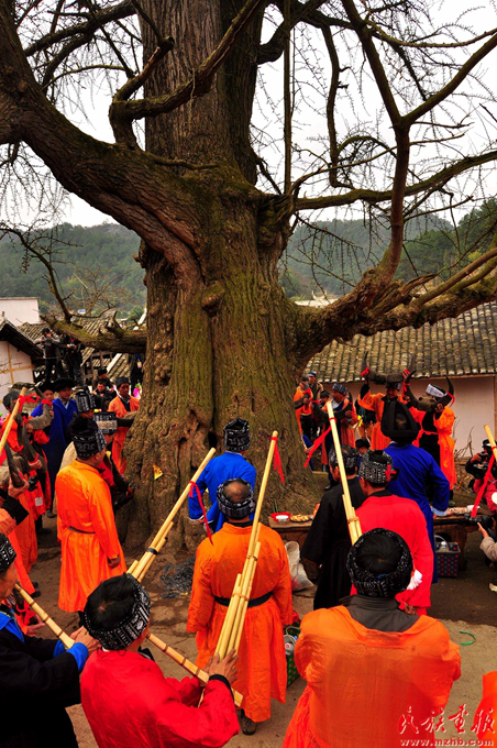 寨老引領(lǐng)眾人來到寨中央的千年銀杏樹下進行祭樹,寨老高舉牛角、男人們吹起蘆笙圍著古樹轉(zhuǎn)圈,司儀唱起“古歌”祈禱